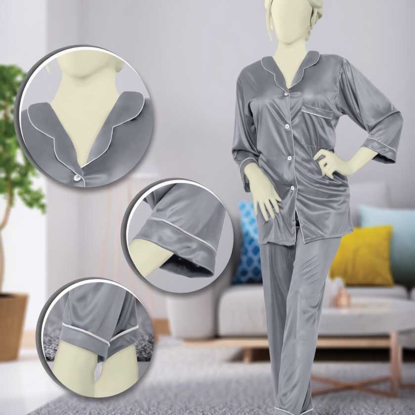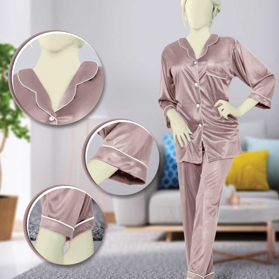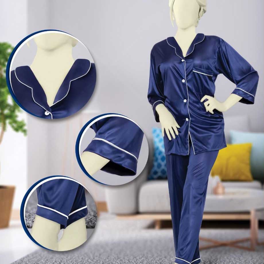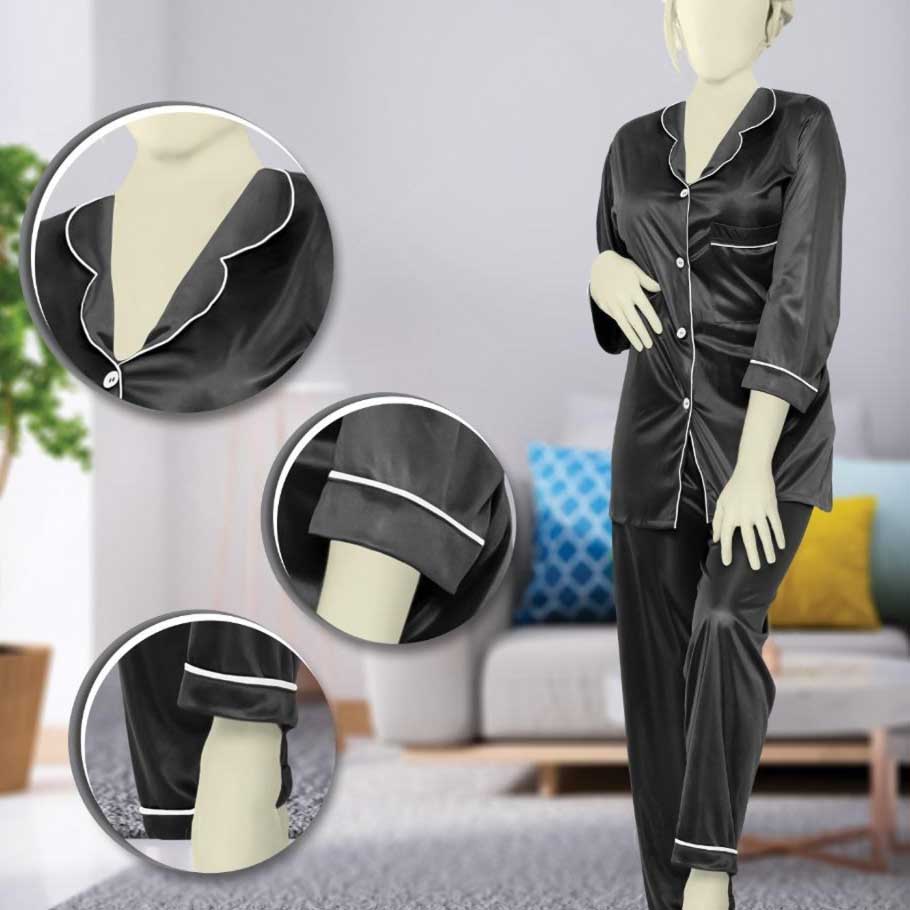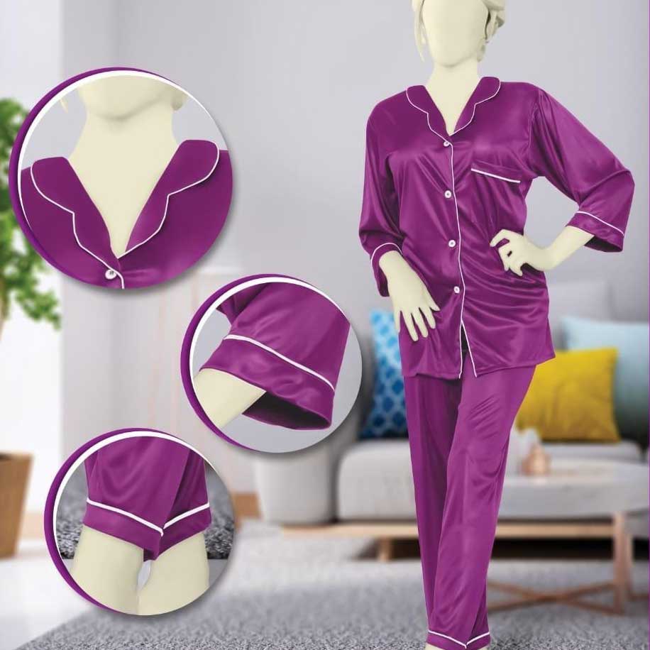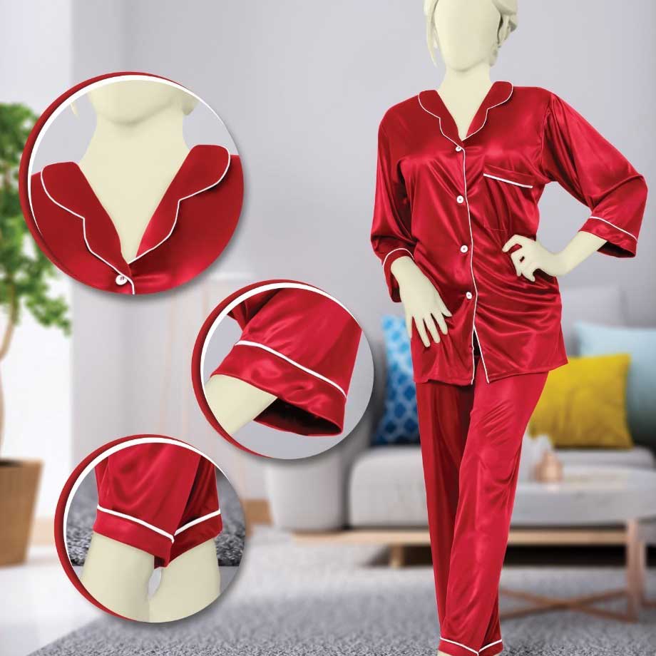 • Glam up your lounger look with the 2 Pcs Red Satin Nightwear Set for Women , which includes a stylish shirt set paired with hand-crafted pants. The high thread count purple satin fabric adds a sense of beauty to our collection of nightwear. This nightwear set is designed for comfort and ease of use, and breathable fabric ensures day-long comfort and durability.