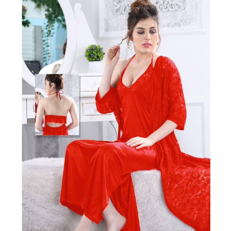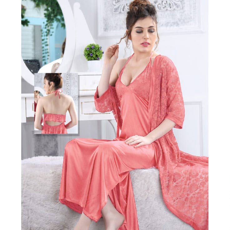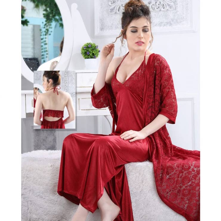 Ladies Long Satin Silk 2-Pcs Lingerie